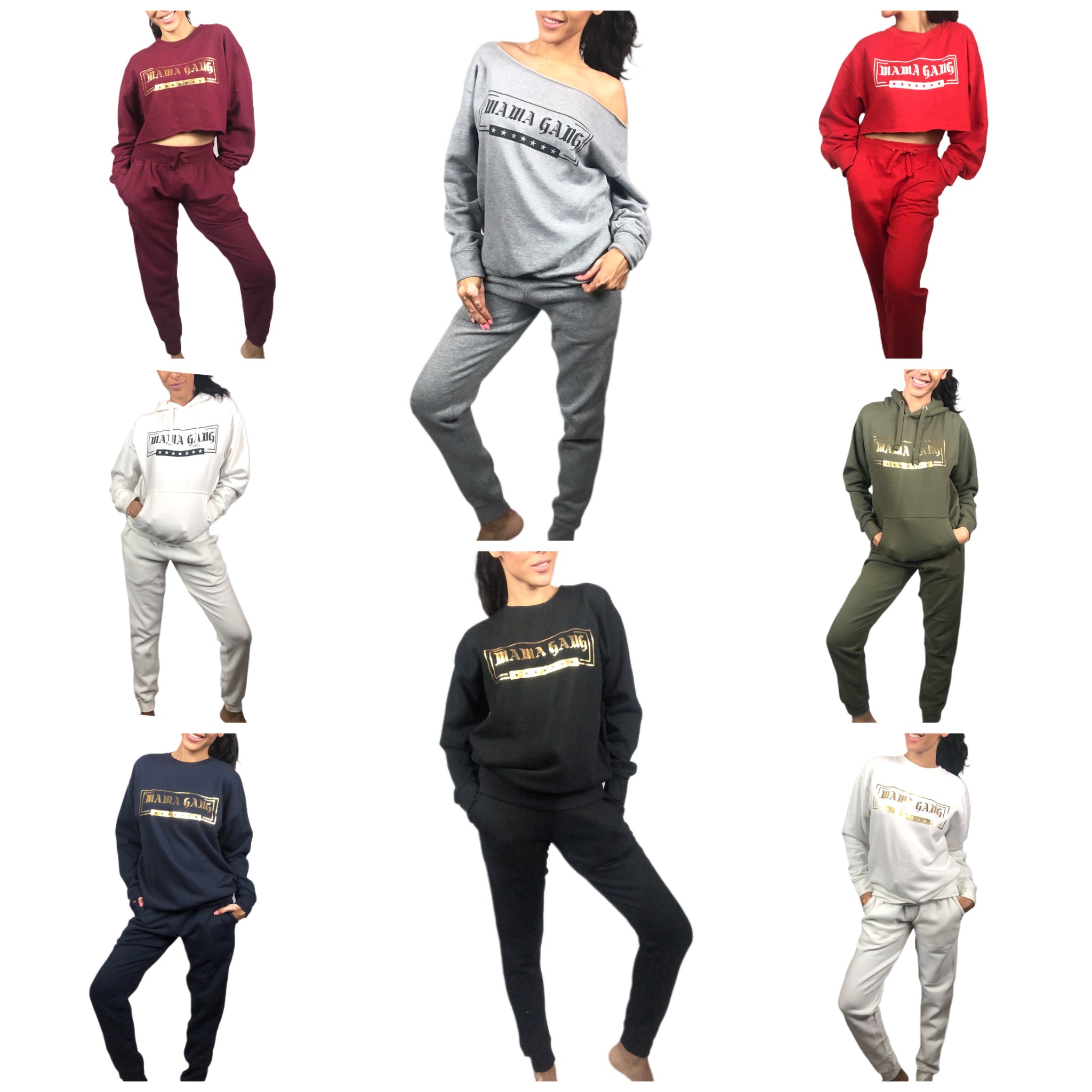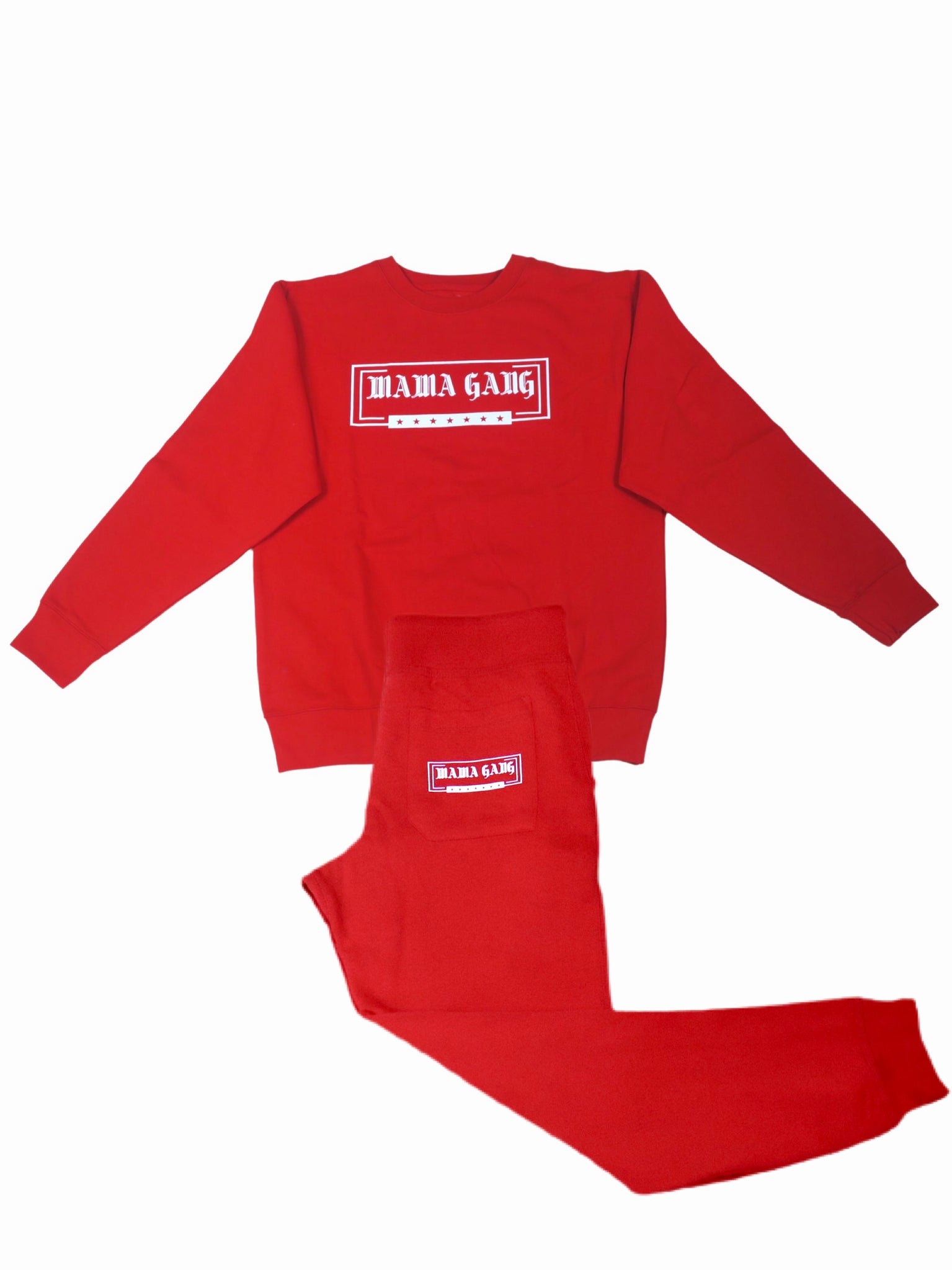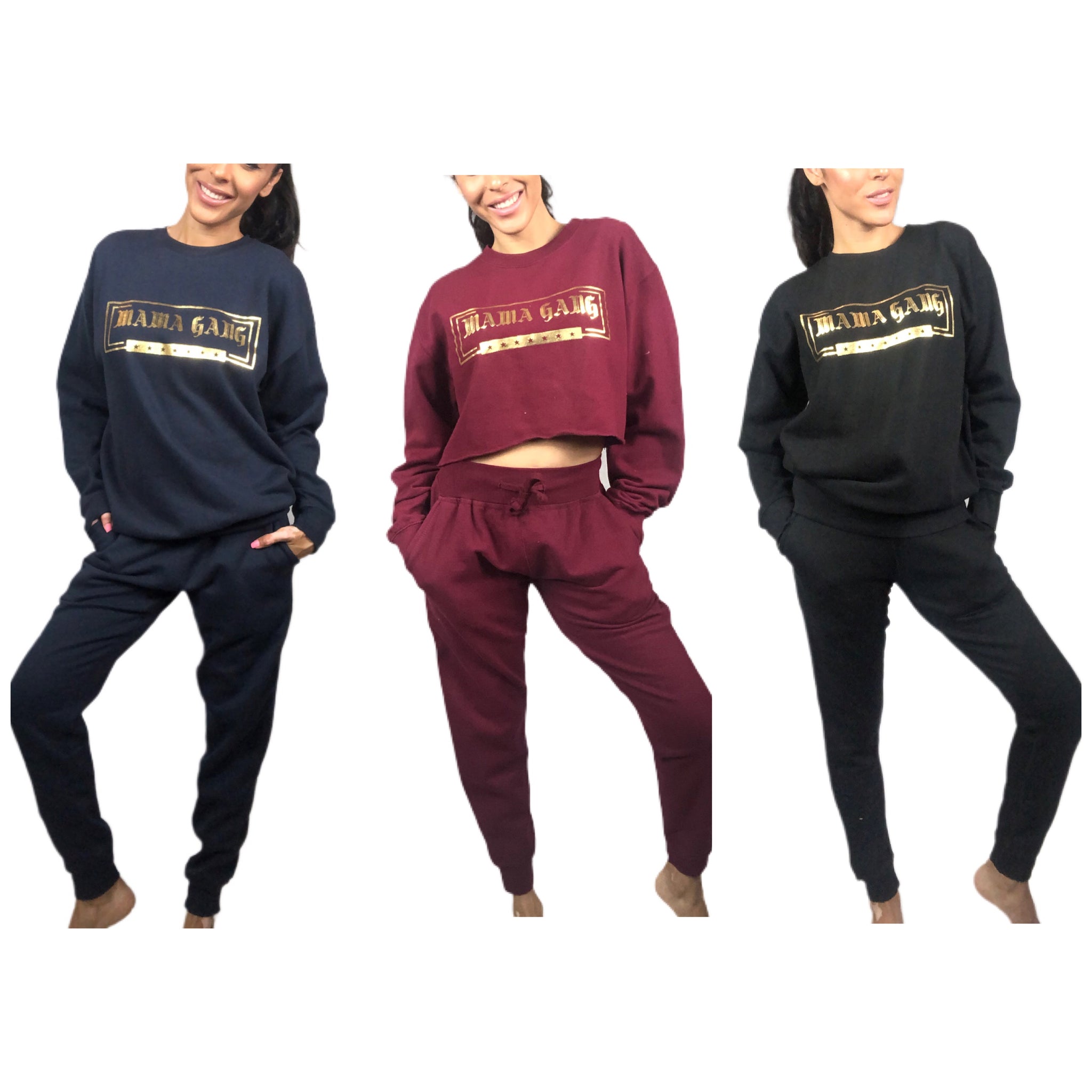 Crew neck sweatshirt with matching joggers. Mama Gang logo on sweatshirt and joggers back pocket.